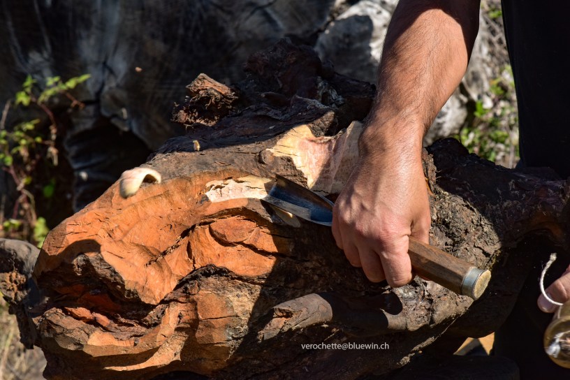 Dans le maquis il repère les racines intéressantes, les met sous terre à sécher lentement sans qu’elles n’éclatent, les dégage puis les tourne et les retourne, cherchant le bon angle, la bonne attaque, l’animal caché à révéler.